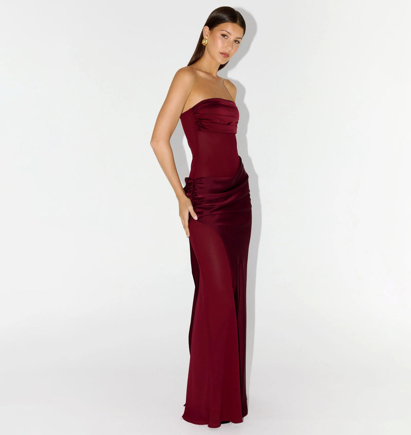 Marguerite Maxi Dress - Strapless Ruched Mesh High Leg Split Dress in Black