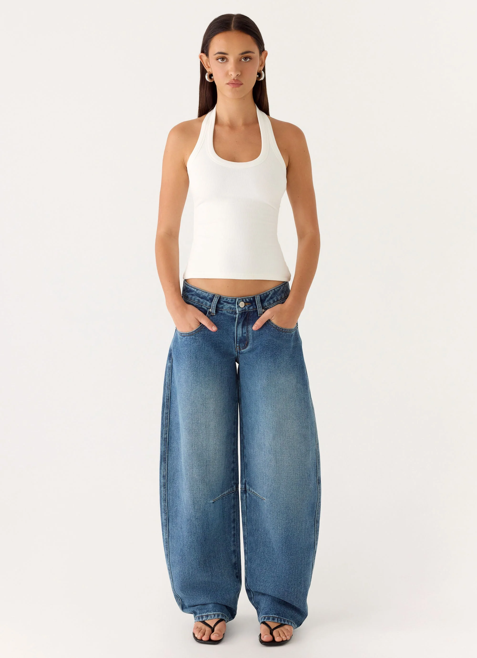 Stevie Low Rise Barrel Leg Jeans - Mid Wash Blue